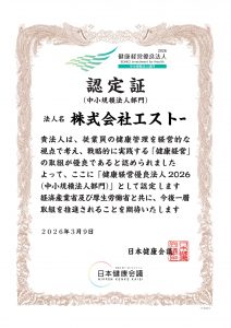 3月9日(月)「健康経営優良法人2026(中小規模法人部門)」に正式認定されましたのでお知らせいたします。